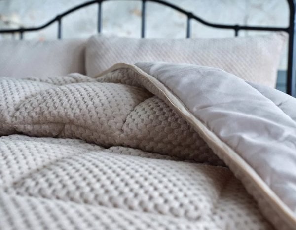 %100 Pes karışımlı, bir tarafı yumuşak tuşeli welsoft kumaş, diğer tarafı microfiber kumaş kullanılmış olup içeriğinde 300gr/m2 ağırlıkta elyaf dolgu kullanılmıştır. Ürünün yastıkları da aynı tarz kumaşlarla tasarlanmış olup içerisinde 800 gr elyaf dolgu kullanılmıştır.